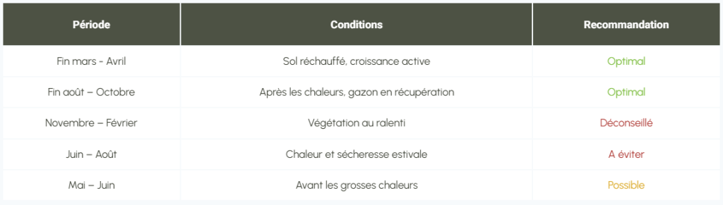⚠️ Attention : en région méditerranéenne, la fenêtre printanière est étroite. Il faut intervenir dès que le sol n'est plus gorgé d'eau, sans attendre les premières chaleurs de mai qui stressent déjà le gazon. La scarification automnale (septembre–octobre) est souvent la plus efficace car elle prépare le gazon à passer l'hiver dans les meilleures conditions.